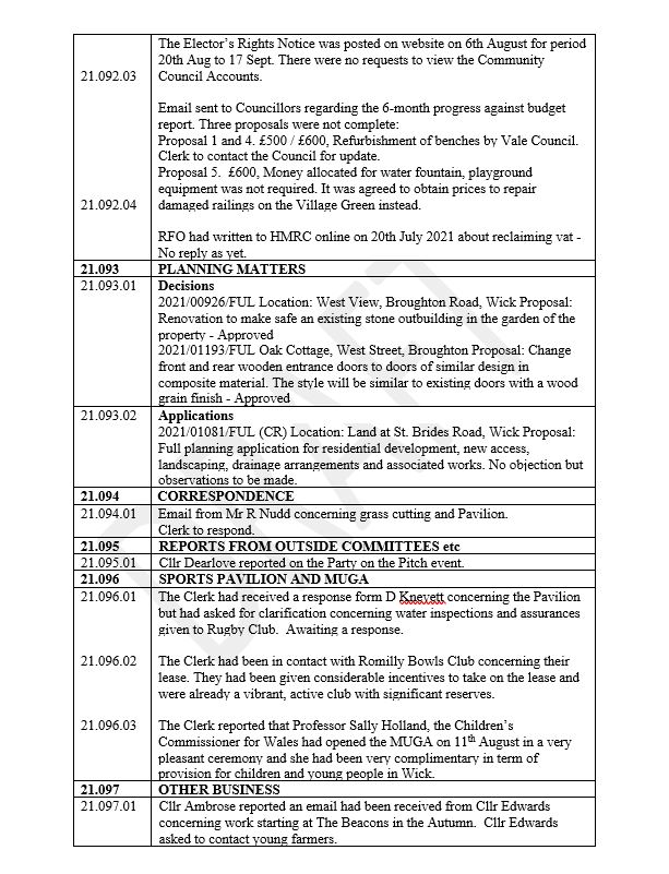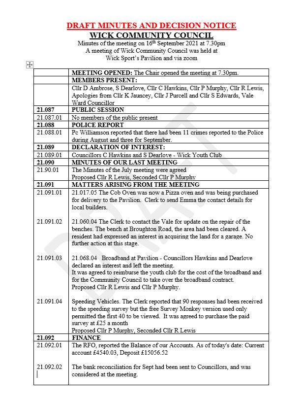 Wick Community Council has a new requirement to publish Decision Notices within 7 working days of the last meeting. This is due to changes to the Local Government and Elections (Wales) Act 2021 for Community and Town Council’s.
