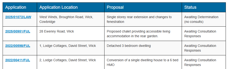 Planning Applications ‘not determined’ within Wick Community Council to 8th January 2026